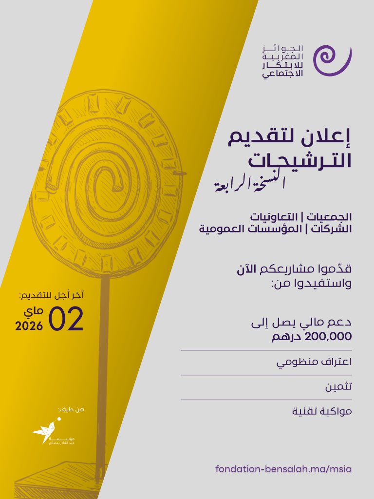 تعلن مؤسسة عبد القادر بنصالح عن فتح باب الترشيحات للمشاركة في النسخة الرابعة من الجوائز المغربية للابتكار الاجتماعي (MSIA)، وهي مبادرة وطنية أُطلقت سنة 2023 بهدف الاعتراف سنويا بالمبادرات والحلول المبتكرة ذات الوقع الاجتماعي القوي، التي أثبتت فعاليتها في مواجهة التحديات المجتمعية الكبرى التي يعرفها المغرب.