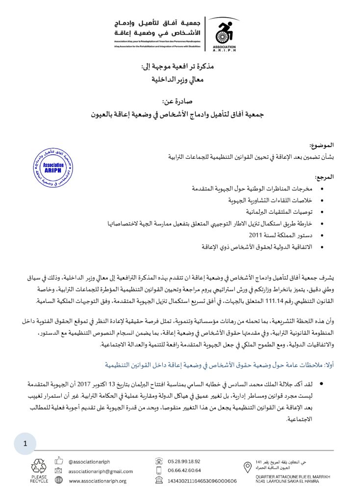 يشرفنا ،معالي الوزير المحترم ، أن نتقدم إلى سيادتكم بهذه المراسلة، مرفقة بمذكرة ترافعية تتعلق بموضوع تضمين بعد الإعاقة ضمن ورش تحيين القوانين التنظيمية للجماعات الترابية، الذي تشرف عليه وزارتكم الموقرة.
