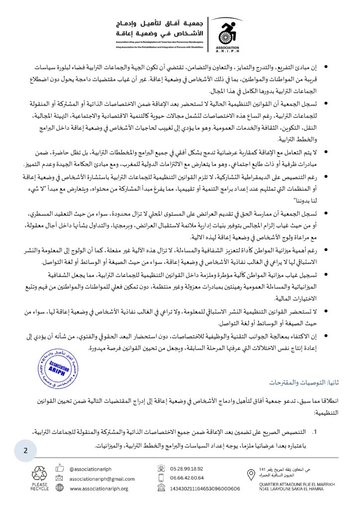 - تسجل الجمعية أن القوانين التنظيمية الحالية لا تستحضر بعد الإعاقة ضمن الاختصاصات الذاتية أو المشتركة أو المنقولة للجماعات الترابية، رغم اتساع هذه الاختصاصات لتشمل مجالات حيوية كالتنمية الاقتصادية والاجتماعية، التهيئة المجالية، النقل، التكوين، الثقافة والخدمات العمومية. وهو ما يؤدي إلى تغييب لحاجيات الأشخاص في وضعية إعاقة داخل البرامج والخطط الترابية.