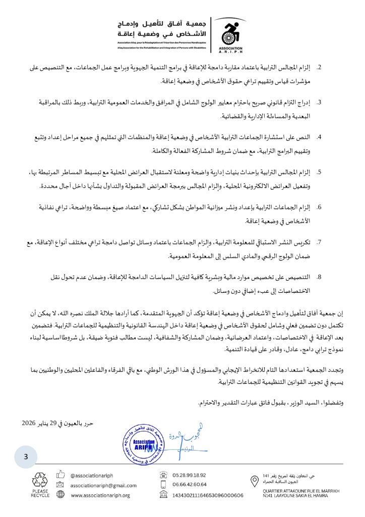 إن جمعية آفاق لتأهيل وادماج الأشخاص في وضعية إعاقة تؤكد أن الجهوية المتقدمة، كما أرادها جلالة الملك نصره الله، لا يمكن أن تكتمل دون تضمين فعلي وشامل لحقوق الأشخاص في وضعية إعاقة داخل الهندسة القانونية والتنظيمية للجماعات الترابية. فتضمين بعد الإعاقة في الاختصاصات، واعتماد العرضانية، وضمان المشاركة والشفافية، ليست مطالب فئوية ضيقة، بل شروطااساسية لبناء نموذج ترابي دامج، عادل، وقادر على قيادة التنمية.